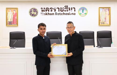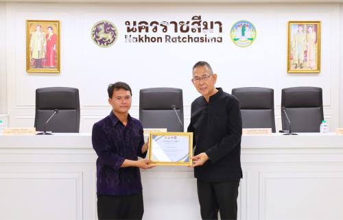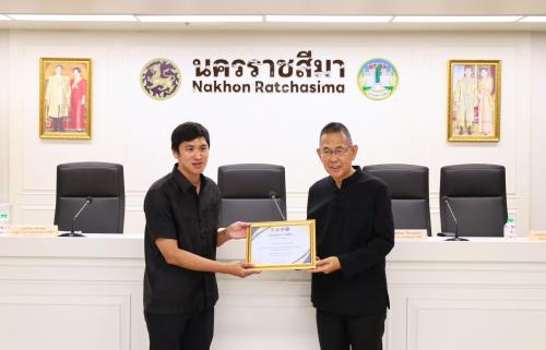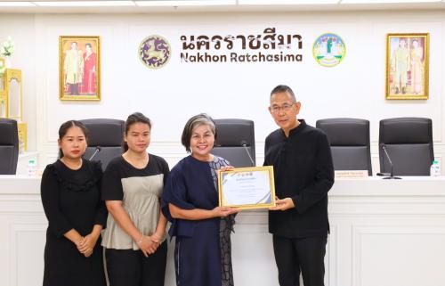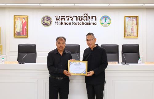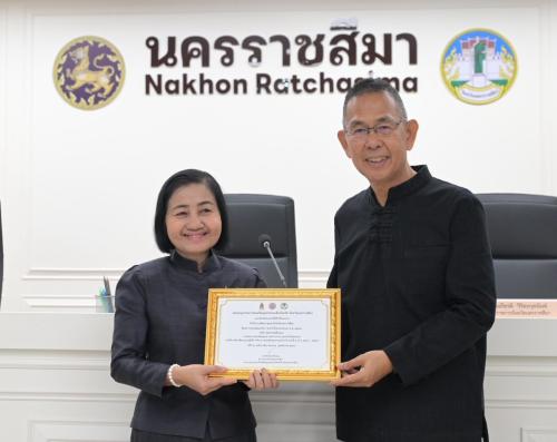 โอกาสนี้ นางสาวพุทธิมาลย์ เชียรพิมาย พัฒนาการจังหวัดนครราชสีมา เข้ารับมอบประกาศเกียรติบัตรจากผู้ว่าราชการจังหวัดนครราชสีมา ในฐานะหน่วยงานที่มีผลการประเมินองค์กร ประจำปีงบประมาณ พ.ศ. 2568 ระดับคุณธรรมต้นแบบ ตามโครงการส่งเสริมชุมชน องค์กร อำเภอ และจังหวัดคุณธรรม ภายใต้การขับเคลื่อนแผนปฏิบัติการด้านการส่งเสริมคุณธรรมแห่งชาติ ระยะที่ 2 (พ.ศ. 2566-2570) พร้อมนำคณะบุคคลเข้ารับมอบช่อดอกไม้ และเกียรติบัตรจากผู้ว่าราชการจังหวัดนครราชสีมา ดังนี้
