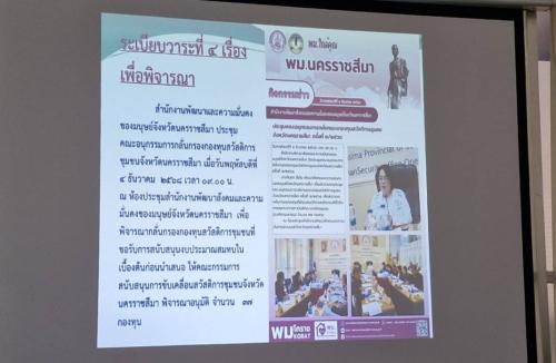 เพื่อติดตามและขับเคลื่อนการดำเนินงานกองทุนสวัสดิการชุมชนจังหวัดนครราชสีมา ซึ่งได้มีการพิจารณาวาระสำคัญ ได้แก่ การพิจารณาอนุมัติโครงการกองทุนสวัสดิการชุมชนที่ขอรับการสนับสนุนงบประมาณสมทบ ประจำปี 2569 และการพิจารณากลั่นกรองกองทุนที่มีคุณสมบัติตามหลักเกณฑ์ที่กำหนดในการพิจารณากองทุนที่ได้รับการสมทบกองทุนสวัสดิการชุมชนจังหวัดนครราชสีมา ครั้งที่ 1/2569 จำนวน 37 กองทุน ประกอบด้วย กองทุนที่ได้รับการสมทบในรอบต่างๆ ตั้งแต่รอบที่ 1 ถึงรอบที่ 13 เพื่อให้การจัดสรรงบประมาณเป็นไปอย่างมีประสิทธิภาพและครอบคลุม โดยเน้นการมีส่วนร่วมของคนในชุมชนในการช่วยเหลือเกื้อกูลซึ่งกันและกัน อันจะนำไปสู่การสร้างชุมชนที่เข้มแข็งและสามารถพึ่งพาตนเองได้อย่างยั่งยืน