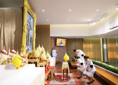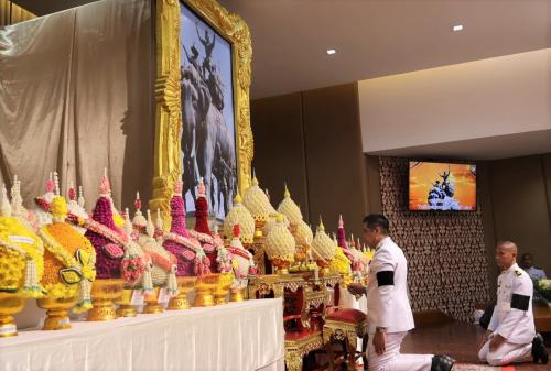 ในการนี้ นางกนกรัชต์ วงษ์กาฬสินธุ์ พัฒนาการจังหวัดนครราชสีมา พร้อมด้วย นางสาวธัญลักษณ์ ชันไธสง ผู้อำนวยการกลุ่มงานประสานและสนับสนุนการบริหารงานพัฒนาชุมชน และบุคลากรในสังกัดสำนักงานพัฒนาชุมชนจังหวัดนครราชสีมา ร่วมพิธีวางพานพุ่มดอกไม้สดถวายราชสักการะเบื้องหน้าพระบรมสาทิสลักษณ์สมเด็จพระนเรศวรมหาราช เพื่อแสดงความจงรักภักดีและน้อมรำลึกถึงพระปรีชาสามารถอันยิ่งใหญ่