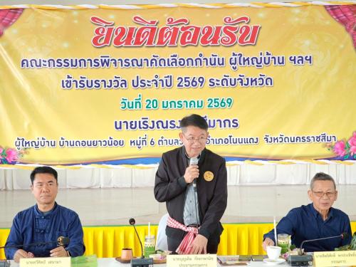 วันอังคารที่ 20 มกราคม 2569 เวลา 09.00 น. นายอนุพงศ์ สุขสมนิตย์ ผู้ว่าราชการจังหวัดนครราชสีมา มอบหมายให้ นายบุญเต็ม กัลยาพานิช ปลัดจังหวัดนครราชสีมา เป็นประธานคณะกรรมการตรวจประเมินผลงานกำนัน ผู้ใหญ่บ้าน เพื่อเข้ารับรางวัลดีเด่นประจำปี 2569 จังหวัดนครราชสีมา (รางวัลแหนบทองคำ) โดยมีเป้าหมายเพื่อคัดเลือกบุคลากรที่มีผลการปฏิบัติงานดีเด่น เป็นที่ประจักษ์ และทำคุณประโยชน์แก่ราชการและประชาชน โดยลงพื้นที่ตรวจประเมิน ณ อำเภอโนนแดง และอำเภอสีดา จังหวัดนครราชสีมา