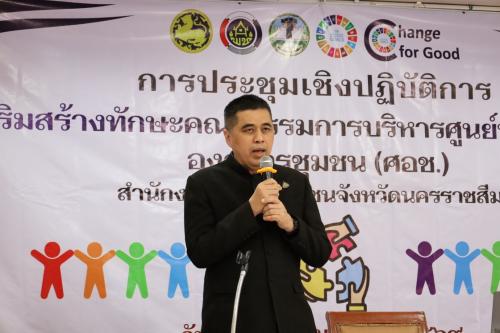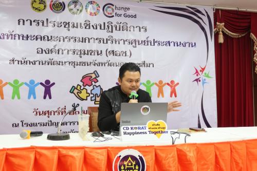 ด้าน นางกนกรัชต์ วงษ์กาฬสินธุ์ พัฒนาการจังหวัดนครราชสีมา กล่าวรายงานว่า สำนักงานพัฒนาชุมชนจังหวัดนครราชสีมา ได้เล็งเห็นความสำคัญของ ศอช. ในฐานะโซ่ข้อกลางเชื่อมโยงการทำงาน จึงจัดอบรมกลุ่มเป้าหมายประกอบด้วย นักวิชาการและคณะกรรมการ ศอช. จาก 32 อำเภอ รวม 160 คน เพื่อเสริมทักษะและกำหนดแนวทางจัดทำแผนและประสานแผนพัฒนาพื้นที่ในลักษณะแผนเดียว (One Plan) ให้สอดคล้องกับบริบทพื้นที่