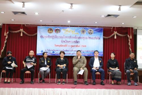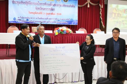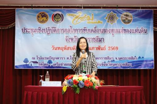นางกนกรัชต์ วงษ์กาฬสินธุ์ พัฒนาการจังหวัดนครราชสีมา กล่าวว่า จังหวัดนครราชสีมาให้ความสำคัญกับการบูรณาการทำงานทุกภาคส่วนผ่านวาระ “1+11 Agenda Korat” โดยเฉพาะวาระที่ 5 เรื่องการป้องกันและแก้ไขปัญหายาเสพติด & To Be Number One ซึ่งกองทุนแม่ของแผ่นดินเป็นกลไกภาคประชาชนที่เข้มแข็งที่สุด ปัจจุบันจังหวัดมีกองทุนแม่ฯ (ปี 2547 - 2568) จำนวน 806 แห่ง และได้ขยายผลสู่หมู่บ้านต้นกล้าในปี 2569 อีก 38 แห่ง