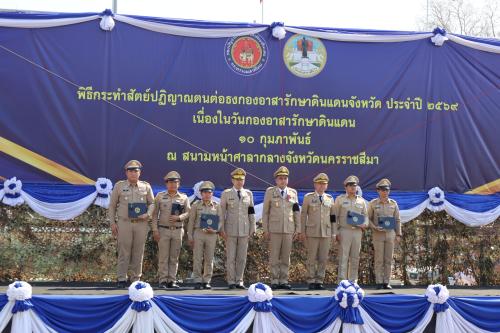 วันพฤหัสบดีที่ 12 กุมภาพันธ์ 2569 เวลา 09.30 น. นายอนุพงศ์ สุขสมนิตย์ ผู้ว่าราชการจังหวัดนครราชสีมา ในฐานะผู้บังคับการกองอาสารักษาดินแดนจังหวัดนครราชสีมา เป็นประธานในพิธีวันคล้ายวันสถาปนากองอาสารักษาดินแดน ครบรอบ 72 ปี ประจำปี 2569 ณ บริเวณสนามหน้าศาลากลางจังหวัดนครราชสีมา เพื่อระลึกถึงวีรกรรมความเสียสละของสมาชิกกองอาสารักษาดินแดนในการปกป้องอธิปไตยและรักษาความสงบเรียบร้อยของบ้านเมือง โดยมีผู้บังคับบัญชา เจ้าหน้าที่ และสมาชิกกองอาสารักษาดินแดน (อส.) จากทุกกองร้อยเข้าร่วมพิธีโดยพร้อมเพรียง
