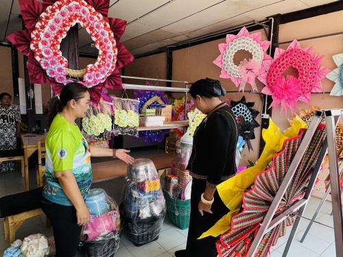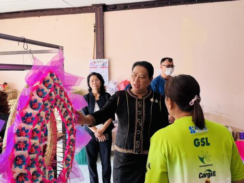 • จุดที่ 1 กลุ่มทำดอกไม้จันทน์ (ม.3 ต.เฉลียง): ติดตามการใช้เงินทุนหมุนเวียนจากกองทุนพัฒนาบทบาทสตรี พบว่าสามารถสร้างงานและรายได้เสริมแก่สตรีในชุมชนได้อย่างเป็นรูปธรรม พร้อมให้คำแนะนำด้านการบริหารจัดการบัญชี