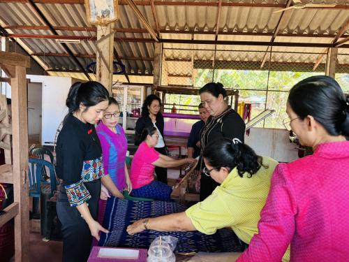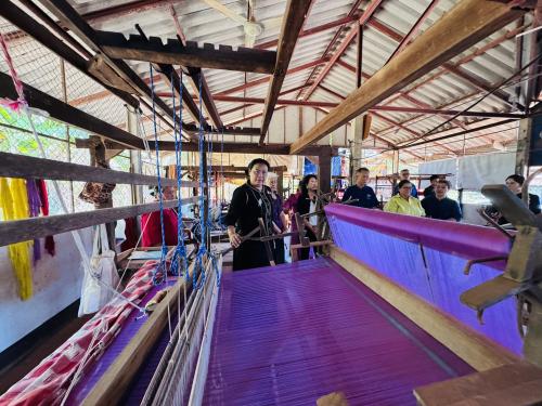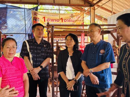 • จุดที่ 2 กลุ่มทอผ้าบ้านหนองจาน (ม.3 ต.ตะแบกบาน): เยี่ยมชมกระบวนการผลิตผ้าทอพื้นเมือง โดยเน้นย้ำการพัฒนาลวดลายผ้าพระราชทานและการขอรับรองมาตรฐานผลิตภัณฑ์ เพื่อเพิ่มมูลค่าและเตรียมความพร้อมเข้าสู่การประกวดระดับประเทศ