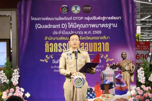 วันอังคารที่ 7 เมษายน 2559 เวลา 11.00 น. นายคณัสชนม์ ศรีเจริญ รองผู้ว่าราชการจังหวัดนครราชสีมา เป็นประธานพิธีเปิดโครงการพัฒนาผลิตภัณฑ์ OTOP กลุ่มปรับตัวสู่การพัฒนา (Quadrant D) ให้มีคุณภาพมาตรฐาน ประจำปีงบประมาณ พ.ศ. 2559 กิจกรรมทดสอบตลาด โดยมีหัวหน้าส่วนราชการหน่วยงานภาคี อาทิ หน่วยงานในสังกัดกระทรวงเกษตรและสหกรณ์ อุตสาหกรรมจังหวัด สาธารณสุขจังหวัด พาณิชย์จังหวัด และประธานคณะกรรมการเครือข่าย OTOP ร่วมกิจกรรม