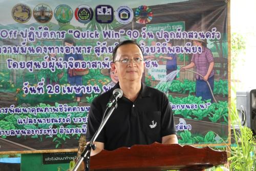 นางกนกรัชต์ วงษ์กาฬสินธุ์ พัฒนาการจังหวัดนครราชสีมา กล่าวรายงานว่า เพื่อรับมือกับความท้าทายจากวิกฤตการณ์ด้านพลังงานที่ส่งผลกระทบต่อค่าครองชีพ กรมการพัฒนาชุมชน กระทรวงมหาดไทย จึงริเริ่มปฏิบัติการ "Quick Win" 90 วัน รณรงค์ให้ทุกครัวเรือนตระหนักถึงความสำคัญของการปลูกผักสวนครัว สร้างความมั่นคงทางอาหาร โดยเริ่มจาก "ผู้นำทำก่อน" เพื่อเป็นต้นแบบและขยายผลสู่ครัวเรือนทั่วทั้งจังหวัด